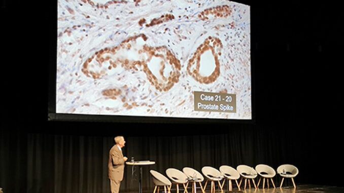 During a recent lecture, Dr. Burkhardt presented his findings based on tissue samples from both young and old men who died after receiving the COVID-19 vaccine. He observed that spike proteins had taken over the sperm-producing organs and the sperm itself.